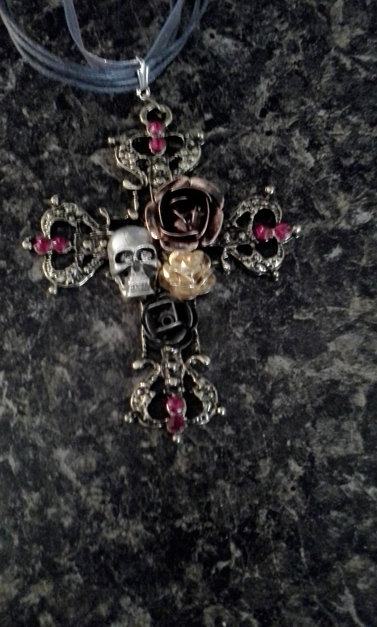 This lovely piece is part of the Holy Rollers Collection. The cross is a unique, made of alloy, and is a on a 17.5" gray ribbon and chord necklace. It's definitely a beautiful piece in person!