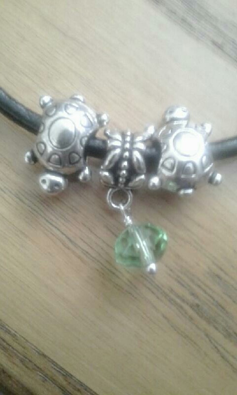 A simple and charming little piece. The light green crystal hangs from the bracelet and is surrounded by turtle spacers on either side. This charm bracelet is a perfect starter gift for charm lovers as well as a great gift for turtle lovers!