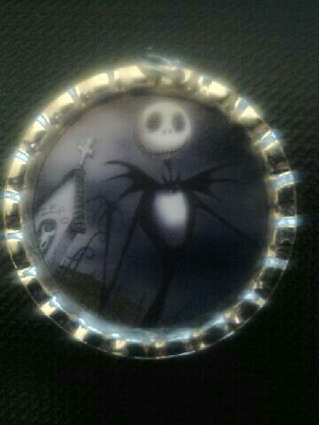 This bottle cap pendant measures 1". It features a picture of Jack Skellington in the Graveyard and is great for fans of the movie.