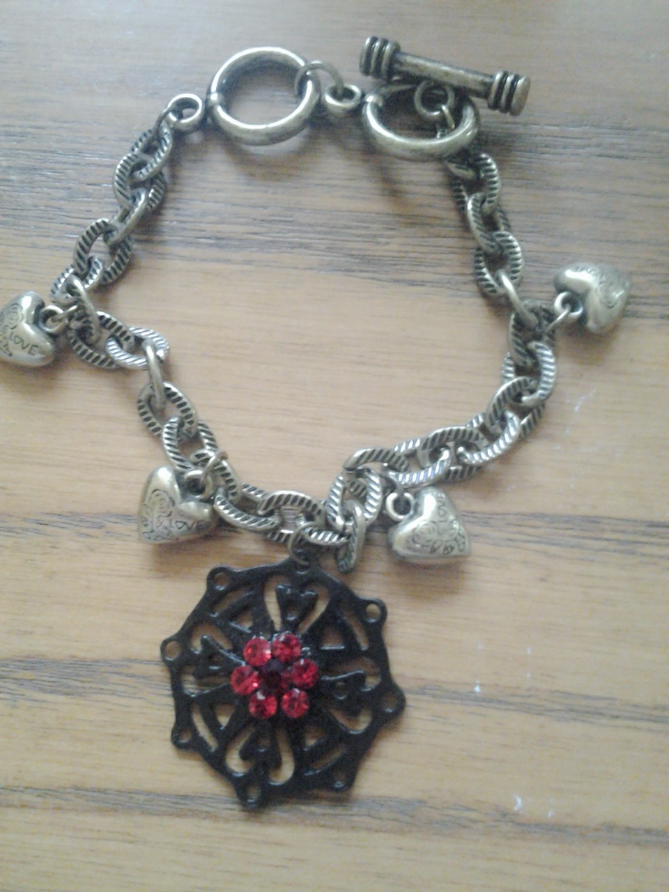 This bracelet measures about 8" and is made antique alloy. The beautiful center piece has red crystals symbolizing the mark of the black widow!