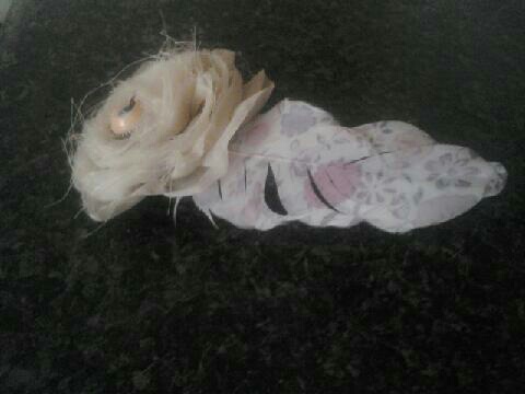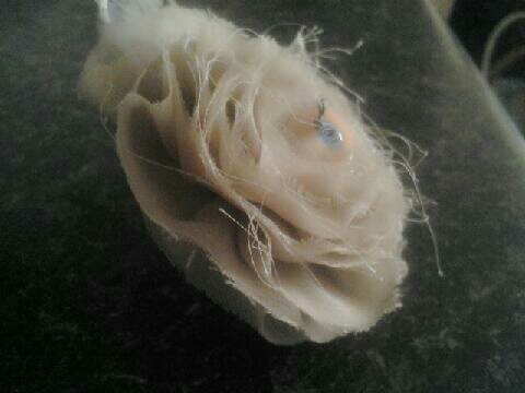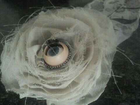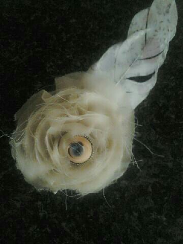This beautiful hair clip is definitely a treasure. A flower fashioned out of fabric holds a blue eye as a center piece. The eye does blink as do the watchful eyes of the Nurses in the ward. A vintage looking feather has been added to give it an old asylum look!