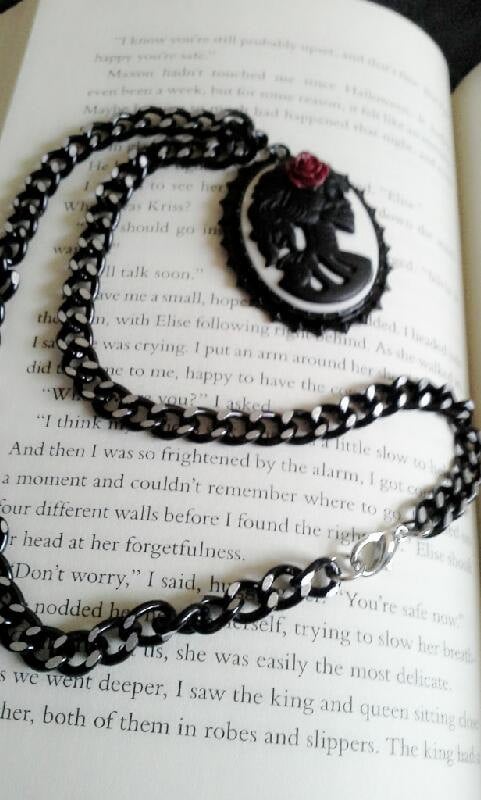 A black skull cameo with a red rose to honor the dead! The necklace is a 16 inch faceted chain.