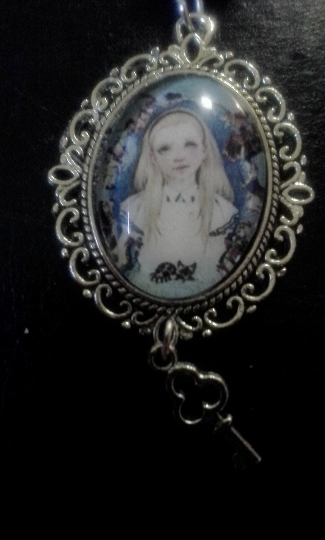 This piece is limited edition. I will only make ONE. Part of the Wonderlost Collection, the pendant features a young, doe eyed Alice surrounded by the Wonderland characters. A little key charm is attached to the pendant and a rabbit and lock charm are attached to the necklace. A beautiful piece for fans of Alice in Wonderland!