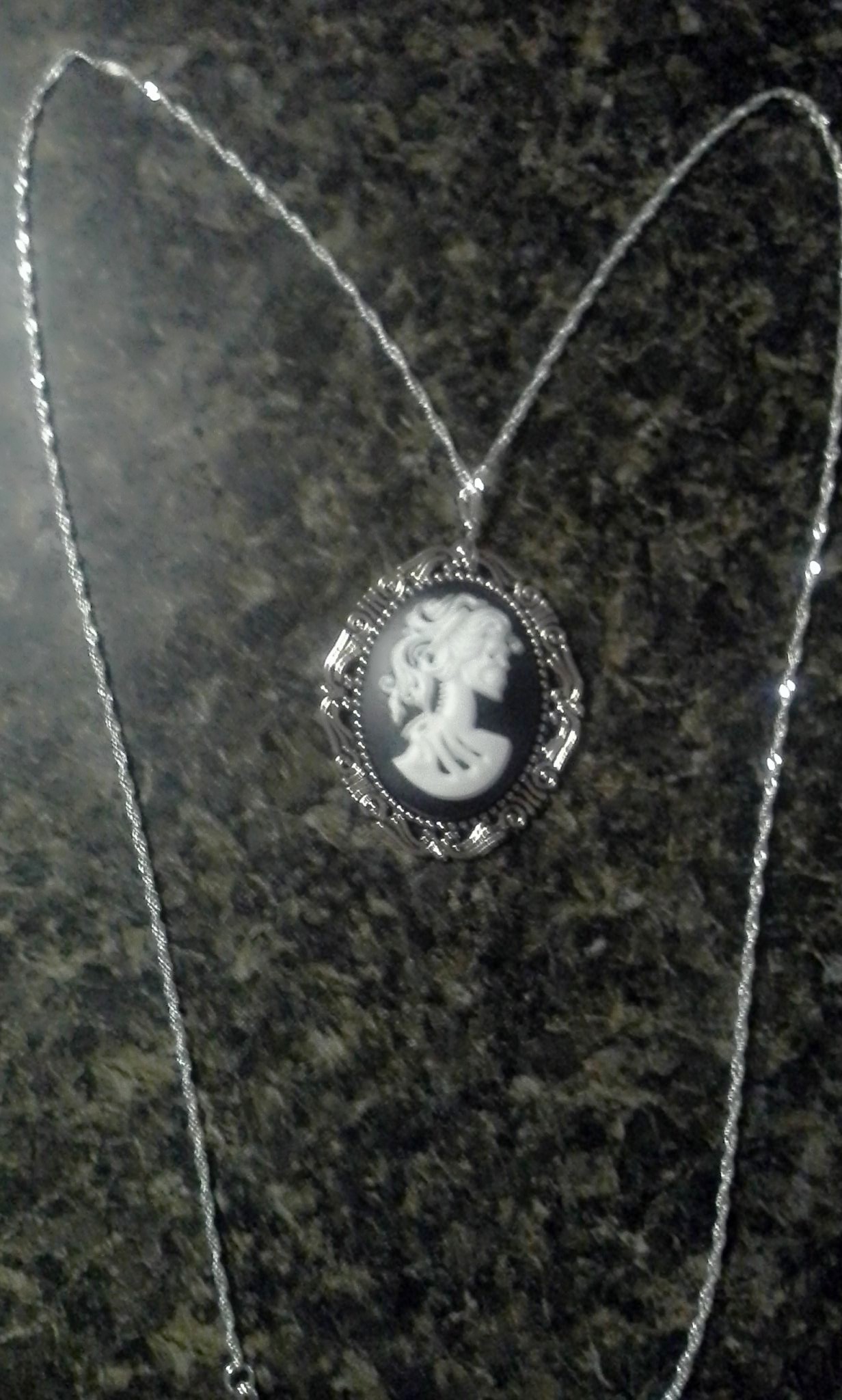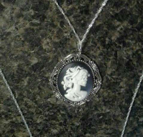This is a simply lovely piece. The chain is sterling silver and measures 30 inches in length giving it an elegant feel. The beautiful skull cameo is in excellent condition! This is limited edition and only ONE will be made. Part of the Pretty, Dead Collection is definitely a great buy for fans of this style!